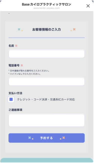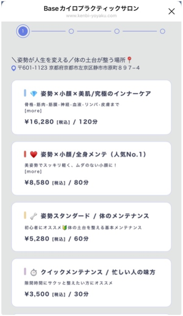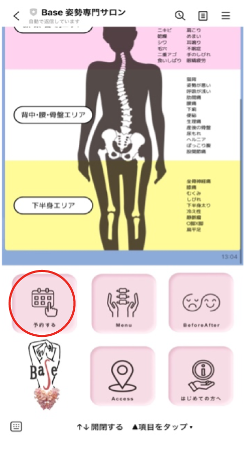 公式LINE画面下部の「予約する」ボタンから、メニューと日時を選択して予約を完了してください。